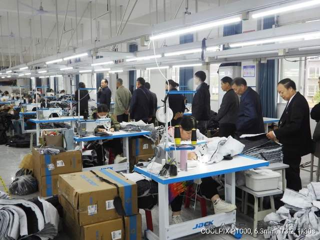 与会人员参观赵家湾村引进浙商服装加工厂生产车间。