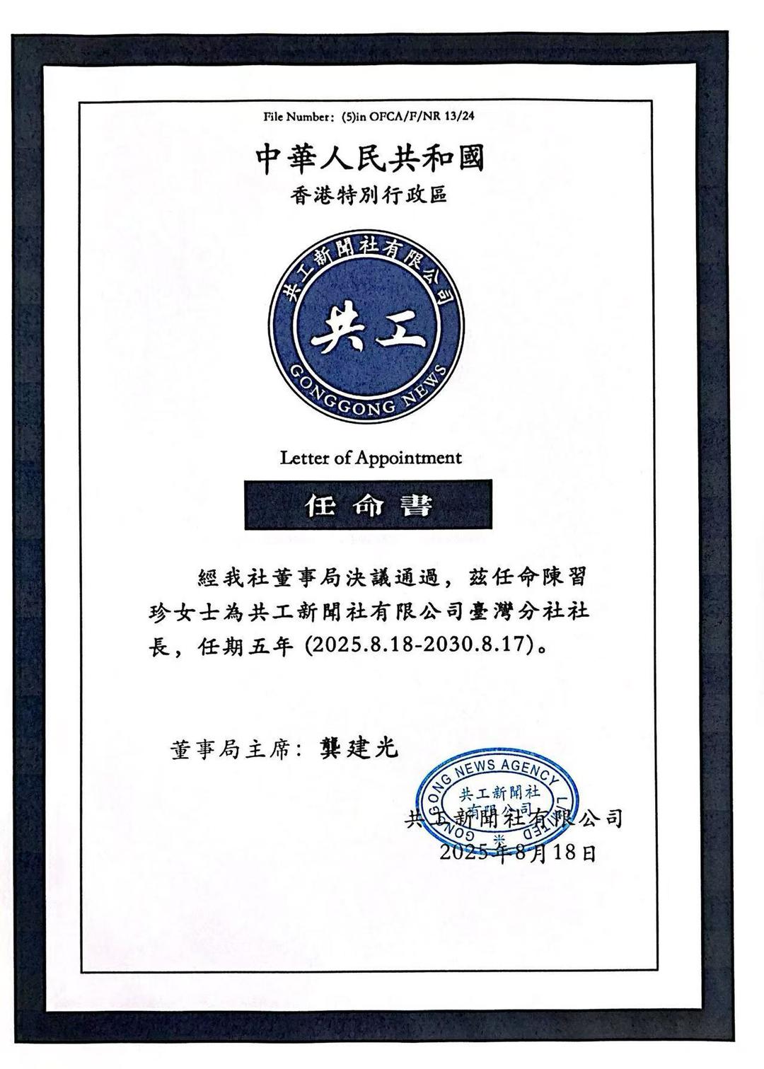 共工新闻社台中讯(记者 龚继杰)经研究决定,共工新闻社正式成立台湾分社,总部设于台中市北屯区沈阳路二段135号2楼之二。根据任命通知,自8月18日起,陈习珍(笔名陈岚)正式出任台湾分社首任社长,任期五年。