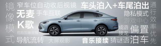 例如在行车辅助方面,新增了通行效率优先和危险加塞提醒功能;在智能泊车方面,新增车头泊入车尾泊出、窄车位自动收后视镜、偏置泊车等功能。智能座舱方面,不仅新增手车互联功能,支持镜像模式、大屏观影、音乐接续、导航流转、隐私模式等,未来还会新增萌宠桌面、游戏中心、无麦K歌、智能语音游戏等新功能,让秦PLUS成为了既能解压又能带娃的出行神器。