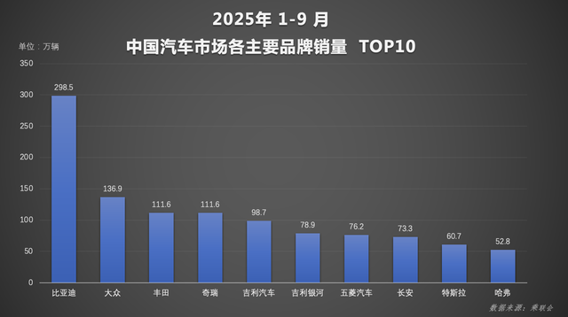 其中,比亚迪汽车(王朝丨海洋)品牌9月销量达35.6万辆,1–9月累计销量298.5万辆,在全市场单一品牌销量排名中稳居冠军,持续巩固头部地位。