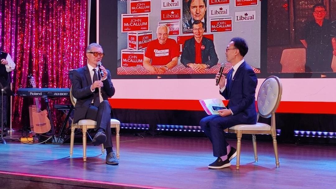 新闻主持人郭然现场采访陈国治。加拿大共工社记者 孙瑞祥 摄