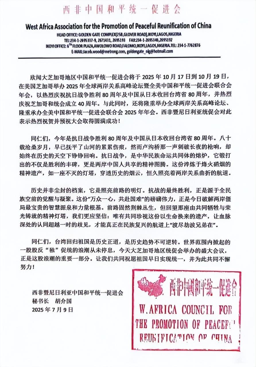 2025年10月17日至19日,“2025全球两岸关系高峰论坛暨全美中国和平统一促进会联合会年会”在美国芝加哥隆重召开。西非暨尼日利亚中国和平统一促进会秘书长胡介国应邀出席,与来自全球各地的政要、侨领、专家学者及华人华侨代表共襄盛举。大会由全美中国和平统一促进会联合会主办,主题聚焦“促进两岸关系发展、推进祖国和平统一、弘扬中华文化、促进世界和平”。