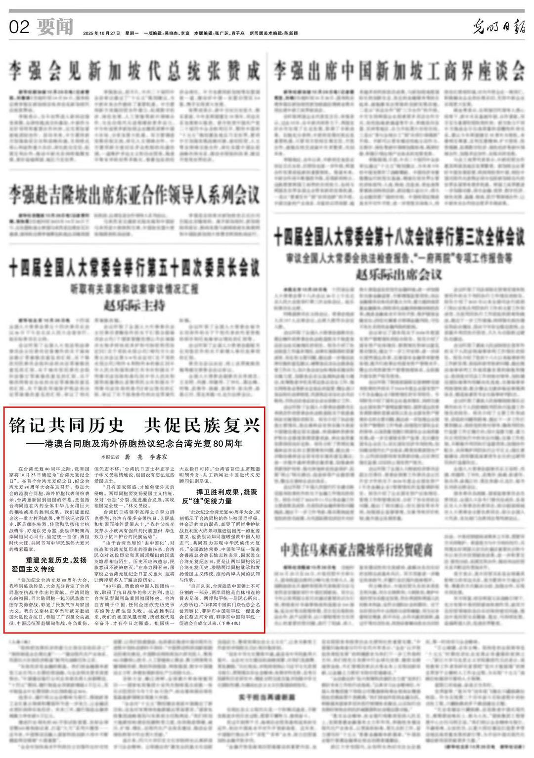 共工新闻社讯(记者廖红麟)10月27日,《光明日报》刊发专题报道《铭记共同历史 共促民族复兴——港澳台同胞及海外侨胞热议纪念台湾光复80周年》,采访报道了中国台湾省首任主席魏道明甥外孙、共工新闻社中国近代文史顾问钮则坚等9人。作为中共中央党报的重要报道,该文以深刻的历史视角与现实关怀,彰显了海内外中华儿女在民族复兴道路上的共同心声与历史担当。