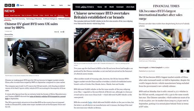 比亚迪在英国市场的高速增长,也吸引了英国主流媒体的高度关注。英国广播公司(BBC)报道“中国电动汽车巨头比亚迪9月英国销量创下新高”;《泰晤士报》则以“中国新晋品牌比亚迪超越英国老牌汽车品牌”为题,指出“两年前英国几乎没人听说过比亚迪”;《金融时报》更进一步强调“英国成为比亚迪最大的国际市场”。