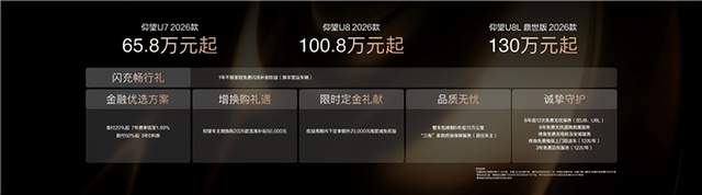 从U7畅享极致驾趣,到U8拓宽人生疆域,再到U8L构筑鼎级安全,仰望2026款旗舰矩阵覆盖了运动豪华、硬派越野、行政豪华三大场景。仰望加闪充,三款新车的联袂登场,是“超越极致,前所未有”品牌精神的最新注脚。仰望始终相信,极致技术不应是冰冷的参数,而应是赋能用户创造价值、革新体验的力量。未来,仰望将继续以颠覆性技术创新为驱动,坚持在这条难而正确的道路上,与所有同行者一道,创造历史,改变世界。