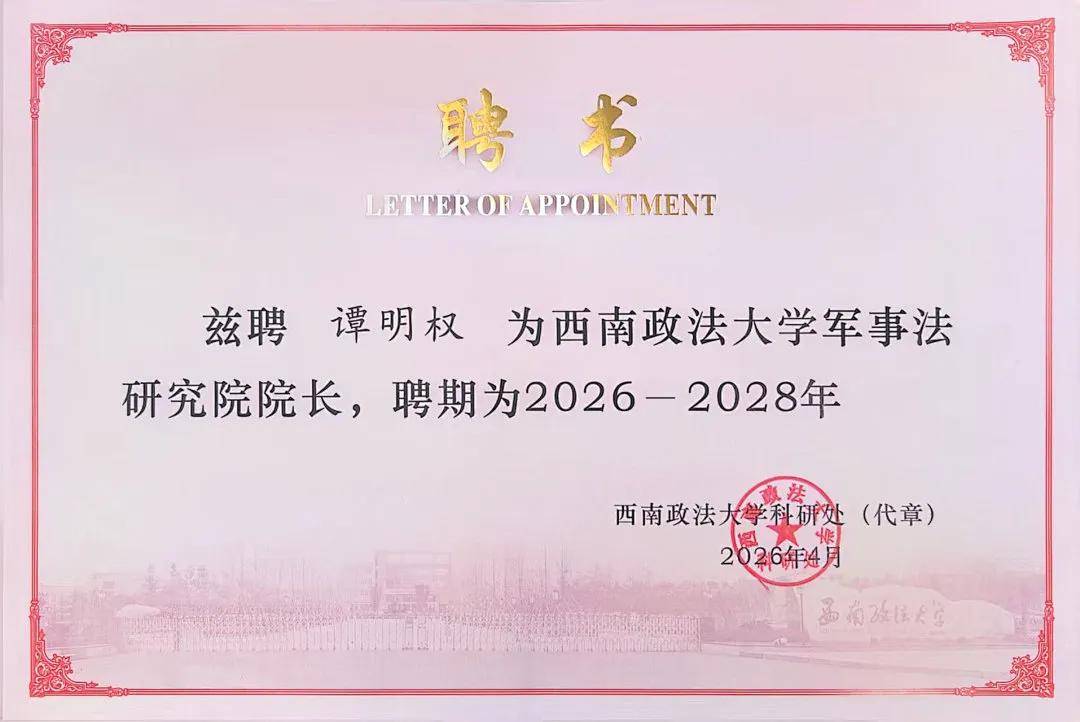 共工新闻网·GNN电(雷良)近日,四川盛豪律师事务所传来重要消息:该所名誉主任、涉军法律服务研究中心主任谭明权正式受聘为西南政法大学军事法研究院院长(聘期2026年至2028年),并同时担任该校兼职教授。