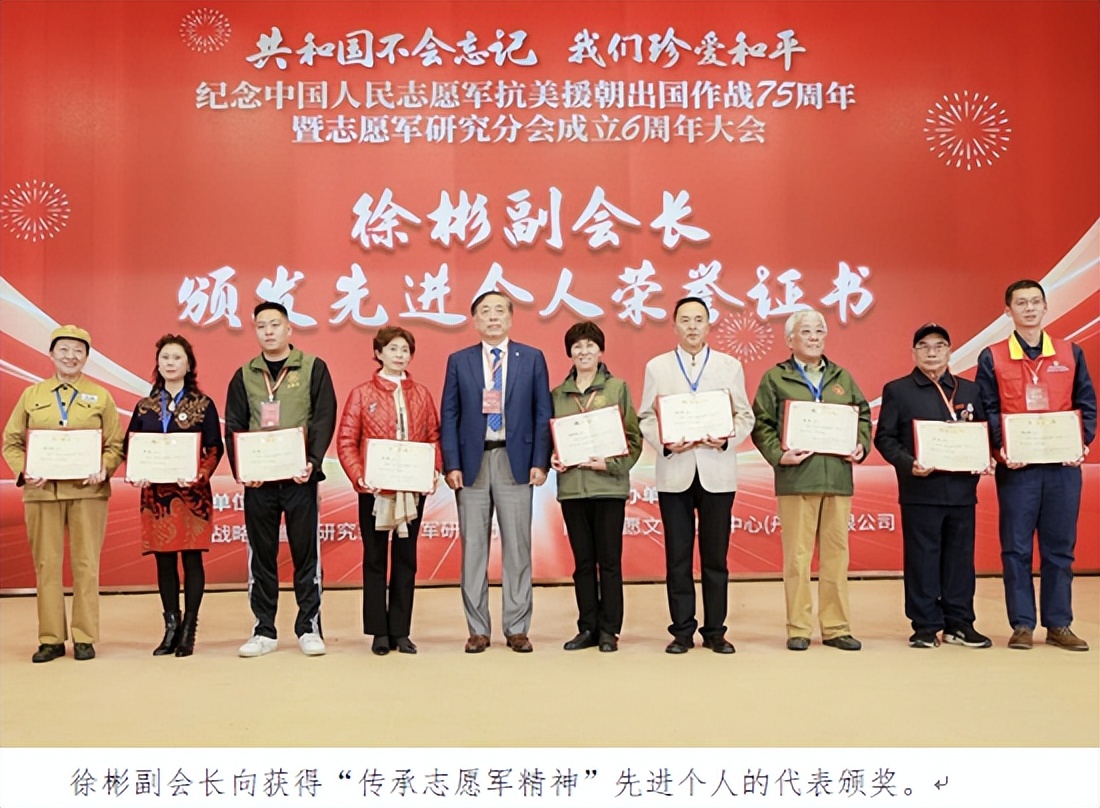 志愿军研究分会刘煜滨副会长宣读了对先进单位和个人的表彰决定。获得“传承志愿军精神”先进单位的有:志愿军精神宣讲团、志愿军精神宣传教育基地、文化教育旅游部、志愿军研究分会艺术团、志愿者服务部、医康养服务部、粤港澳大湾区办事处、志愿文化创意中心(丹东)有限公司、密山市东北老航校研究会、齐齐哈尔博物馆、四川省保健协会。志愿军研究分会战歌艺术团获得特别贡献奖。获得“传承志愿军精神”先进个人的有杨涛、李冬生、刘登赋、洪雯艳、刘磊、崔遂川、彭宇、张林、郑珠滨、刘航、郝秦、申旺、朱英、张燕敏、张京、贺小民、邓玉明、孙嘉怿、杨翌梅、孙爱娥、常纪庆、曹家麟、徐怀堂、徐树年、侯书军、谷源潭、徐涛、邹晓明、华山、陈绕天、张志勇、何凤莲、吴玉娟、朱平、赵敬伟等35人。