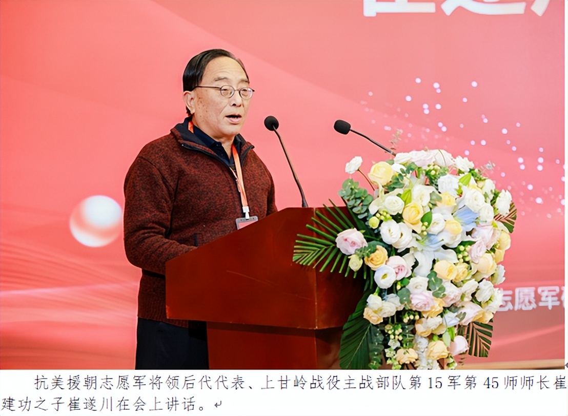 抗美援朝志愿军将领后代代表、上甘岭战役主战部队第15军第45师师长崔建功之子崔遂川在会上讲话。他说,上甘岭战役是抗美援朝战争中作战时间最长,战斗最为激烈的著名战役,我的父亲时任45师师长,在战斗中创造了以弱胜强的战争奇迹。上甘岭战役打出了军威,打出了国威。涌现出黄继光等战斗英雄和特功八连等英雄群体,有38位烈士与敌人同归于尽。志愿军精神激励着中国军民不断奋进。他的讲话,不仅表达了对志愿军前辈的敬仰之情,而且传递了弘扬传承志愿军精神的坚强决心。