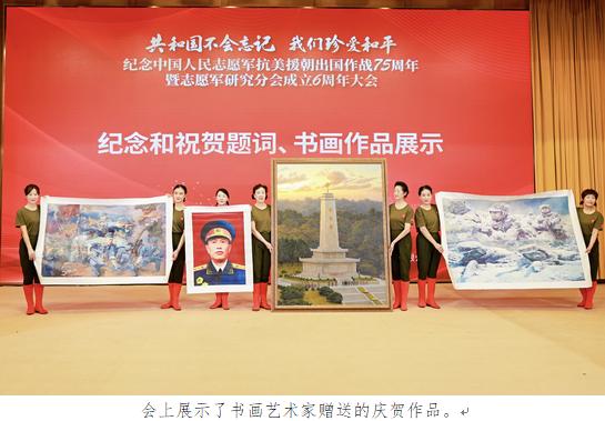 为纪念中国人民志愿军抗美援朝出国作战75周年,祝贺志愿军研究分会成立6周年,一些志愿军老部队的高级将领、退役将军和书画艺术家发来了纪念和祝贺的题词。原国防大学政委赵可铭上将发来的题词是“立国之战 千秋伟业”;原南京军区政委雷鸣球上将发来的题词是“民族魂 中国梦”;原海军副政委王登平中将发来的题词是“缅怀先烈 致敬英雄”;原总政宣传部副部长嵇绍莹少将发来的题词是“保家卫国 千秋伟业”;原军事博物馆馆长袁伟少将发来的题词是“英明决策 历史丰碑”;原国防科技大学电子科学院政委段共生少将发来的贺词是“山河壮丽 国泰民安”;原军旅著名书法家刘建武大校发来的题词是“铁血铸军魂 丹心传精神”;著名书法家赵达武发来的贺词是“雄赳赳气昂昂 跨过鸭绿江”;著名书法家苏芬兰发来的贺词是“英烈赴国难,忠魂护九州”;著名书法家邹贵生发来的贺词是“铁血征程七五载 丹心研学六春秋”;中国东方巨龙书画艺术家研究协会理事长刘明友赠送了油画作品《邓华将军》《钢铁冰雕连》《铭记浴血荣光》;朝鲜社会科学院博士、北京朝艺在线文化交流有限公司总经理金哲赠送了庆贺油画作品《中朝友谊塔》,著名书画艺术家腾墨之、郑克石、张恒明、张元洁、张卫东、程波、洪大亮、刘尚峰等也都赠送了书画作品。