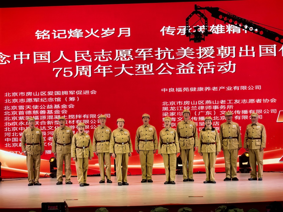 (江山 常魁星 陈胜 黄象红 孙连东 杨洋 陈浩天)“雄赳赳气昂昂,跨过鸭绿江”唱响了中国人民志愿军出国作战的号角,10月25日,纪念中国人民志愿军抗美援朝75周年大型公益活动在北京市房山区韩村河山庄会议中心盛大举行,活动由北京志愿军纪念馆(筹)、北京市房山区爱国拥军促进会、中良福苑健康养老产业有限公司等联合举办,社会各界人士齐聚一堂,共同缅怀志愿军先烈,弘扬伟大的抗美援朝精神。