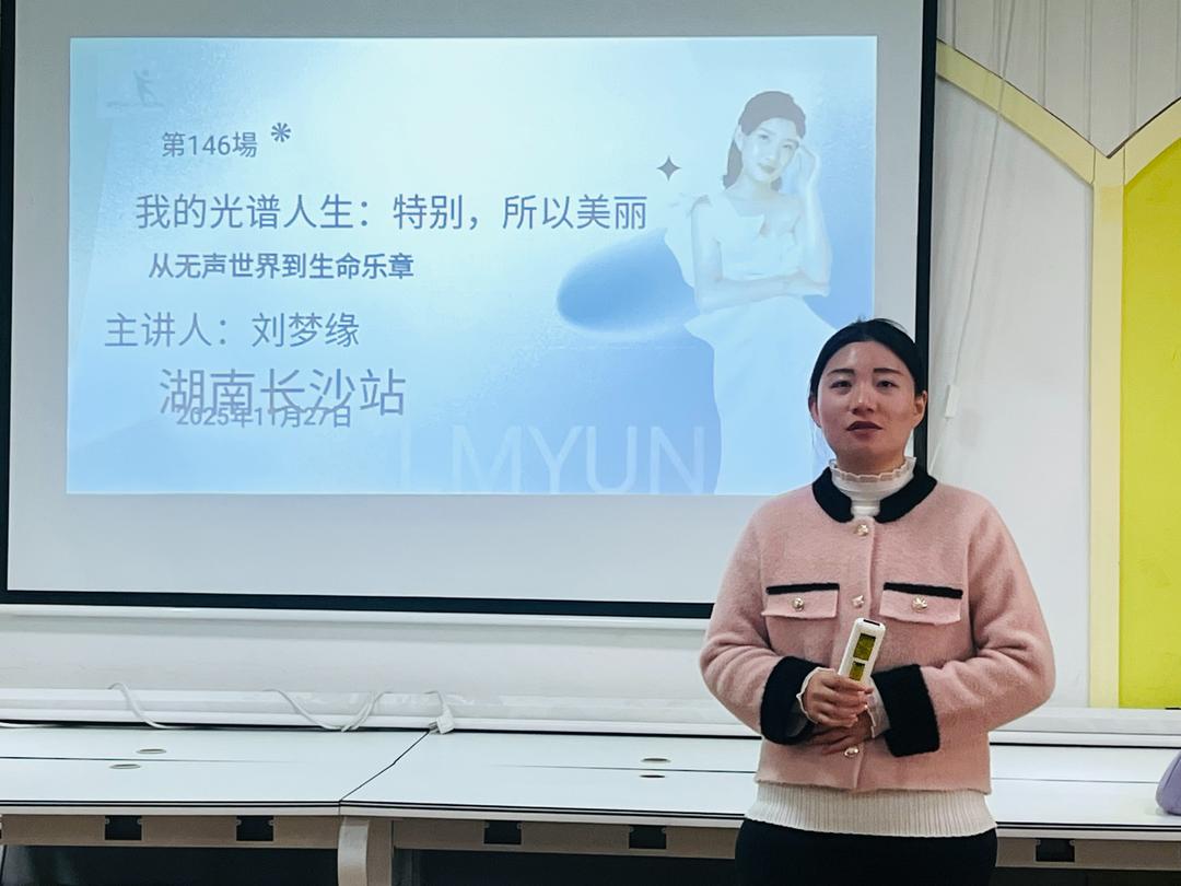 讲座现场,刘梦缘身着浅色洋装,站在投影幕前。屏幕上“我的光谱人生:特别,所以美丽”的字样与她的形象交叠——这是她用27年生命走出的真实故事,从“无声世界”到“生命乐章”,她的分享成为现场最动人的篇章。