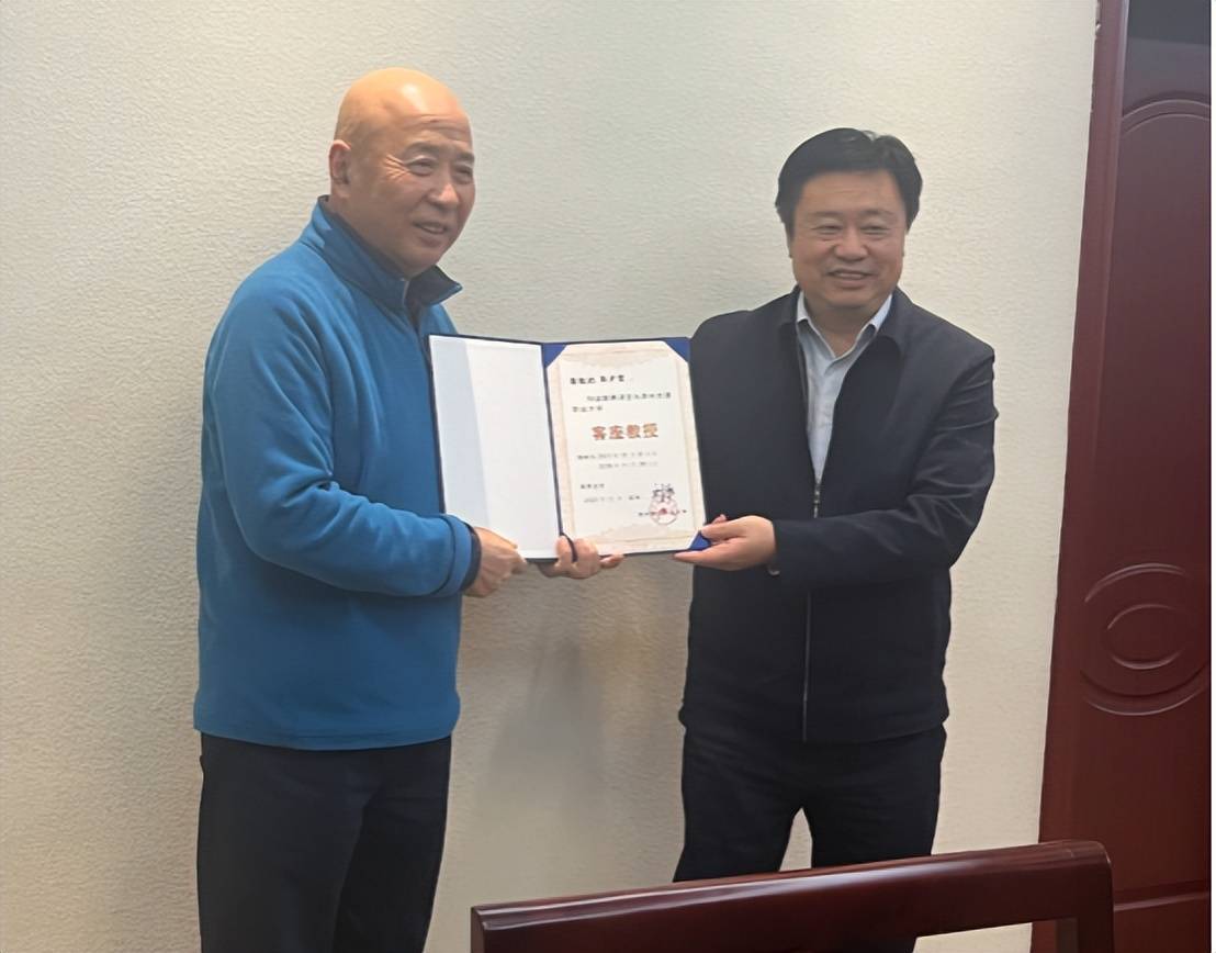 贵州交通职业大学党委书记何兴发(右一)为中国药食同源生命科学院院长张少堂教授(左一)颁发“客座教授”任期五年证书。共工社 发