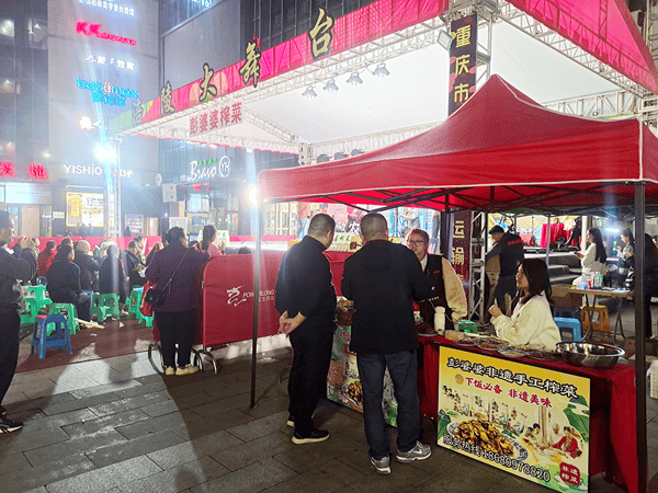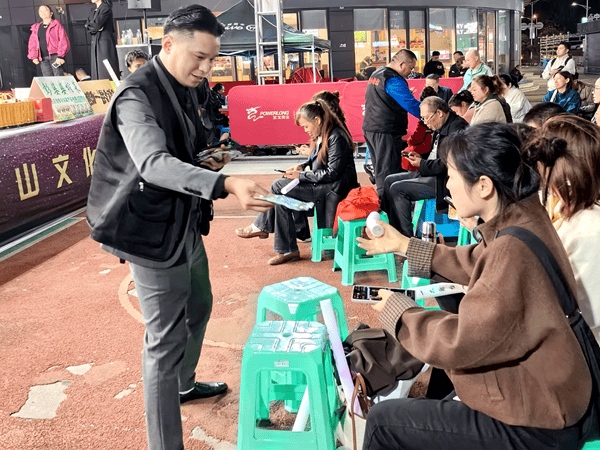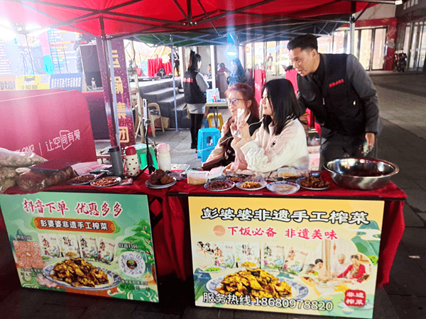 在活动现场,彭婆婆非遗手工榨菜无疑是一大亮点。该品牌始终秉承“精雕非遗味,细品榨菜美”的理念,现场不仅展示和销售了糊辣壳味、麻辣味手工榨菜、口口脆菜芯、鲜脆菜丝、微辣菜丝等多款产品,还通过线上直播的形式,让更多网友能够领略到非遗手工榨菜的独特魅力。重庆渝贵乐农副产品有限公司董事长彭荣贵先生也亲临现场,与工作人员一同向市民赠送产品,分享这份来自涪陵的“非遗”味道。