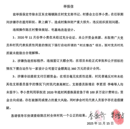 保定市徐水区东史端镇陈庄村村委会主任李某贵被村民实名举报