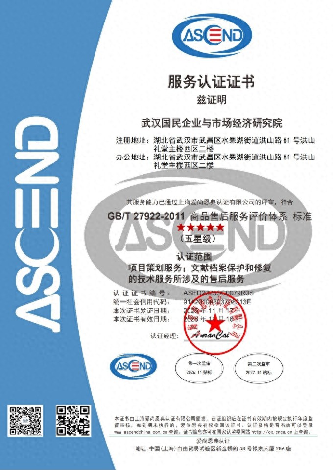 在服务体系建设方面,“武研院”亦已取得国家权威机构颁发的商品售后服务评价体系五星级认证(GB/T 27922-2011),服务能力涵盖项目策划、文献档案保护和修复等环节的售后服务,进一步夯实了“以服务创价值”的综合保障能力。