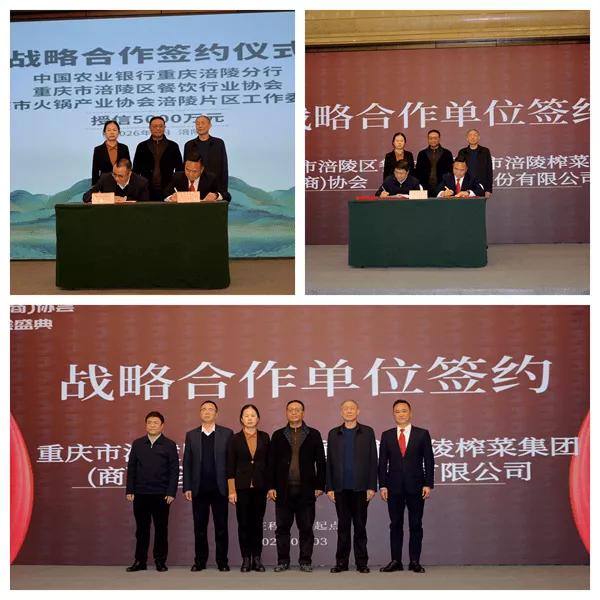 在阳森、陈圣玲、陈国华等领导见证下,中国农业银行涪陵分行、涪陵榨菜集团股份有限公司与涪陵区餐饮(商)协会签署战略合作协议,搭建“金融+食材+餐饮”全链条合作平台,助推产业协同升级。