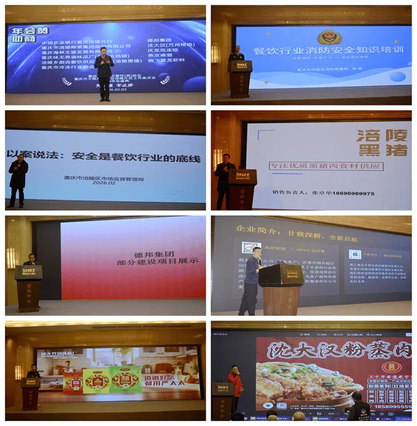 大会前,涪陵区消防救援支队综合指导科科长肖刚作《餐饮行业消防安全知识培训》,区市场监管局食品三科科长李杨以《以案说法:安全是餐饮行业的底线》开展宣讲,为餐饮经营筑牢安全底线。同时,涪陵黑猪、重庆德邦集团、重庆味无界调味(严太太鸡精)、沈大汉(万州格格)等战略合作单位进行项目与产品展示品鉴,深化上下游资源对接。