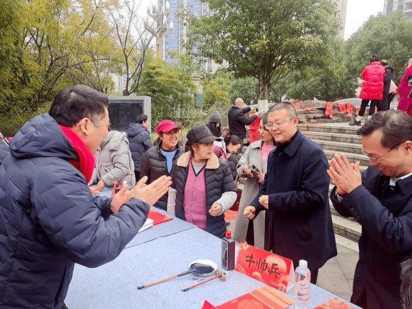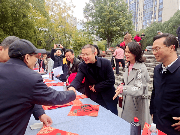 涪陵区江东街道党工委书记夏嘉川,党工委副书记、办事处主任卢兵,党工委委员、宣传委员、统战委员杨滔,涪州书院院长张乔英莅临活动现场,与书画名家交流创作理念,并为现场居民送上新春问候。