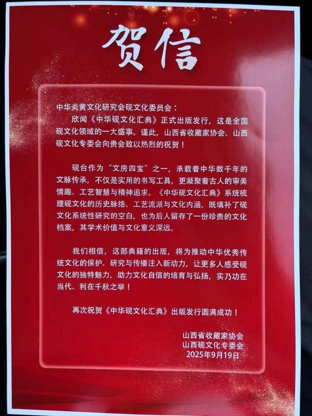 欣闻《中华砚文化汇典》正式出版发行,这是全国砚文化领域的一大盛事。谨此,山西省收藏家协会、山西砚文化专委会向贵会致以热烈的祝贺!