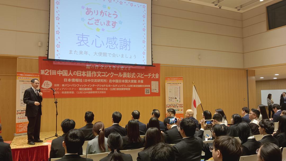 共工新闻社北京讯(记者 王群) 11月7日,由日本侨报社(日中交流研究所)与日本驻华大使馆联合主办的第21届全中国日语作文比赛颁奖典礼暨演讲大会在日本驻华大使馆隆重举行。日本驻华大使金杉宪治、大赛发起人、日本侨报社总编辑段跃中,以及来自全国多所高校的获奖选手代表、日籍指导教师及部分获奖学生家长共同出席了活动。
