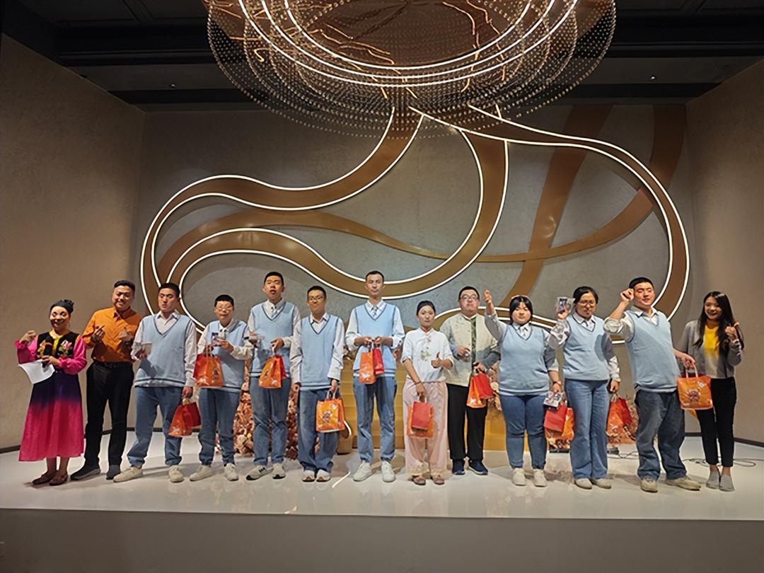 朗诵结束后,来自台湾的爱心人士——南投荣誉观护协会观护人洪浚诚、南投草屯法指公庙主任委员黄翊魁手持十份精心准备的礼物登上舞台。礼盒系着粉蓝相间的丝带,内装定制卡通音乐盒与手绘绘本。他们面带微笑,逐一将礼物送到十位“星星的孩子”手中。洪浚诚先生弯腰递礼时,轻声询问一位扎羊角辫的小女孩:“喜欢这个小兔子音乐盒吗?”女孩羞涩低头,随后抬眼望向他温柔的眼眸,嘴角扬起,软糯回应:“喜……喜欢,谢谢叔叔。”黄翊魁先生则对刚表演完古筝的张扬任鼓励道:“你的《战马》弹得真有力量,这个绘本送给你,里面有好多勇敢的小故事。”张扬任紧握礼物,脸颊泛红,虽未多言,却主动伸手与黄翊魁轻轻相握,眼中满是感激。有孩子当场小心翼翼打开礼盒,音乐响起时眼睛一亮,转头与老师伙伴分享喜悦,现场温情满溢。洪浚诚先生现场表示:“每个孩子都是上天赐予的宝贝,希望这些礼物能带给他们快乐,也愿两岸同胞持续携手,为特殊儿童撑起一片爱的天空。”黄翊魁先生则强调,公益无界、爱心相连,未来将继续关注两岸特殊儿童群体,为他们的成长助力。