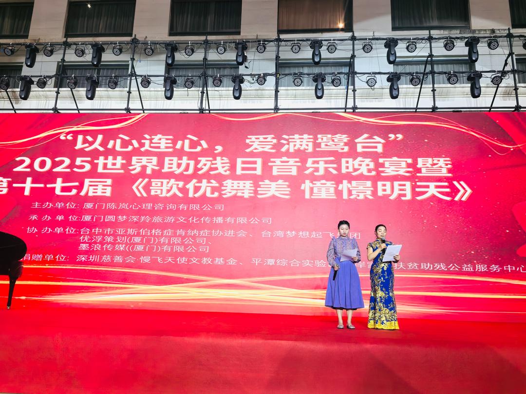台湾共工新闻社讯(熊馨缘)12月3日晚,翔鹭国际大酒店灯火璀璨、暖意涌动。“以心连心·爱满鹭台——2025孤独症青年音乐交流会”温情启幕,为第34个国际残疾人日增添一抹动人的亮色。活动由厦门陈岚心理咨询有限公司主办,厦门圆梦深羚旅游文化传播有限公司承办,台中市亚斯伯格症肯纳协进会、台湾梦想起飞乐团等机构协办,国际新闻视角报社、台湾共工新闻社等十余家媒体共同支持,并获得深圳慈善会•慢飞天使文教和平潭综合实验区扶贫助残公益服务中心的大力协助。