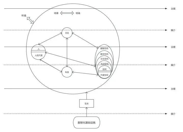 空间及形态即空间的尺度,包括互动空间、交互空间、数字空间、数智空间。作为承载人、文化、科技等要素的载体,其尺度研究在新形态空间理论中具有基础性地位,对空间的物理尺度、呈现形式的探讨是支撑后续相关研究的根本。
