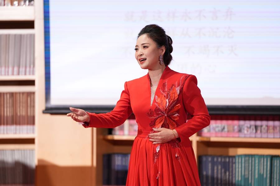 讲唱会最后是杜瑶演唱的《兵团的心》。她眼含热泪,以饱含激情、真挚高亢的歌声,唱出了“大漠埋不了这颗心,流沙卷不走这颗心”的炽热告白,深情诠释了兵团人代代相传的忠诚与担当,将整场气氛推向高潮。