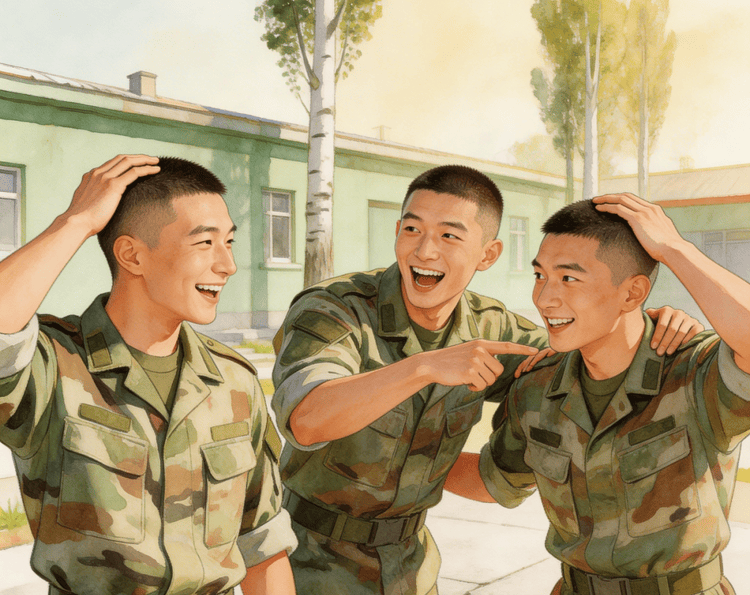 训练场上,阳光照在一排排干练的板寸头上,闪着一道道乌黑油亮的光环……那是青春的光芒,也是军人的荣光。很快,我就习惯了板寸头,觉得这才是军营男子汉该有的模样。后来,我调入部队机关,发现有专门的理发室。不忙时可以随时去理,基本不用排队等候。理发师是专业出身,手艺明显高出一筹。在不违反军规的前提下,理发师能把我的头发理出点“型”来——额前略长,两侧渐短,梳起来有几分精神气。