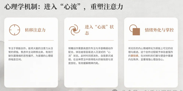 不用有任何专业基础,三步就能轻松体验铜雕疗愈的力量。轻触铜板,借着铜的金行特质,慢慢平复浮躁的心绪;轻轻锤击,靠铜的共振调动身体阳气,疏通经络、缓解疲惫;随心刻画纹理,借着金行的收敛之力,将负面情绪悄悄转化,同时铜元素滋养脏腑,帮身体实现五行平衡,让身心慢慢归于平和。