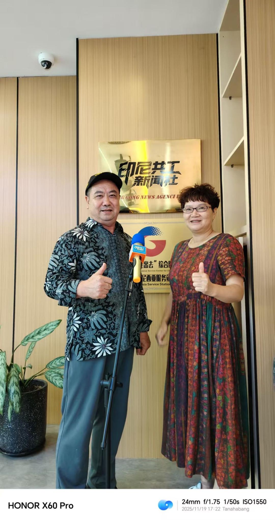 图说:陈日铃董事长、印尼托马斯社会论坛(智囊智库)主席HANDOYO接受记者采访。印尼共工社发