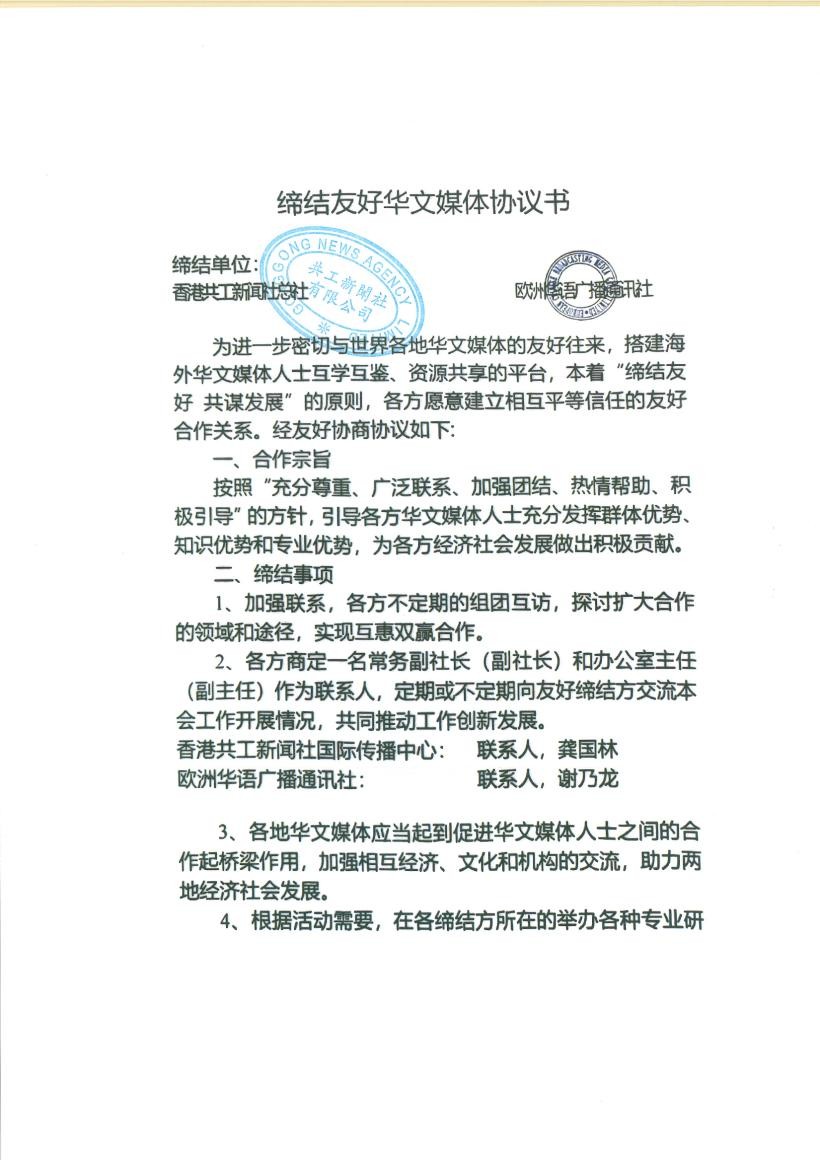 共工新闻社讯(记者廖红麟) 2025年11月28日,香港共工新闻社国际传播中心与欧洲华语广播通讯社在港正式签署战略合作协议,标志着双方在国际传播与文化交流领域迈入深度协同的新阶段。此次战略携手,将进一步推动中欧华文媒体在全球范围内的互联互通,共同为强化中华文化国际影响力、构建中国对外话语体系注入新动能。