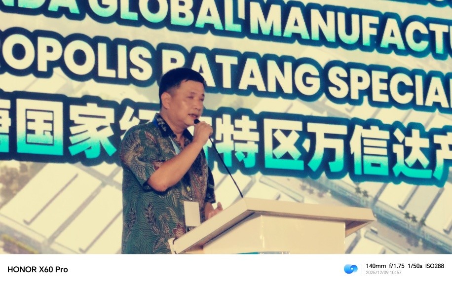万信达控股董事长陈日铃在致辞中回顾了集团二十余年来在广州、湖南、越南、缅甸及印尼投资建厂的实践经验。他表示,自2023年5月10日签约落地巴塘工业城经济特区以来,万信达始终将“深耕印尼、服务产业、携手共赢”作为使命,全力推进园区建设、招商招引与企业服务,以实际行动响应中国“一带一路”倡议与印尼“全球海洋支点”战略。