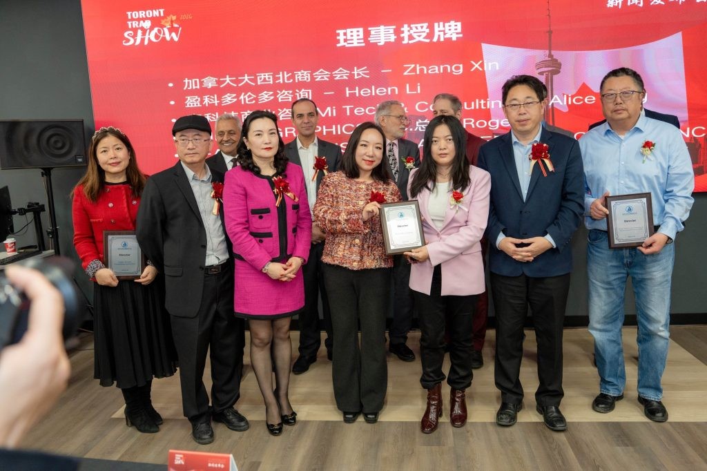 发布会期间还举行了理事证书颁发仪式。加中企业出海服务中心新增五位理事,分别是:非洲国际贸易大使王大伟(Louis Claude Hermann Mefire)、加拿大大西北商会会长Zhang Xin、盈科多伦多咨询负责人Helen Li、麦科技商业咨询负责人Alice Ding,以及CHEELO GRAPHICS INC.总裁Roger。
