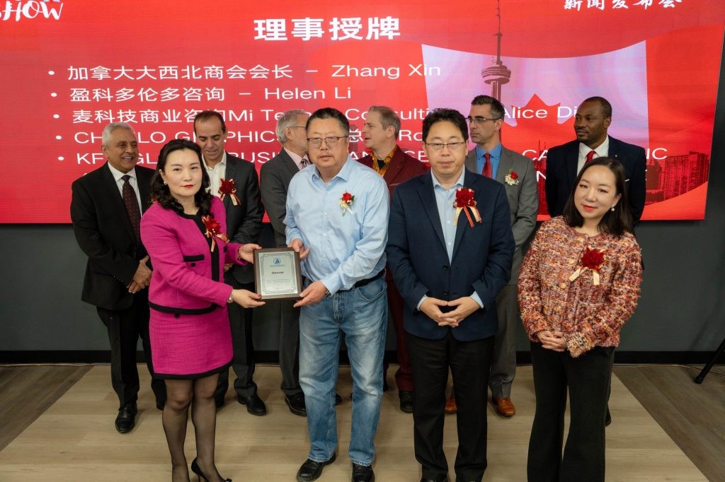 出海中心为加拿大大西北商会会长Zhang Xin颁发理事证书。加拿大共工社 发