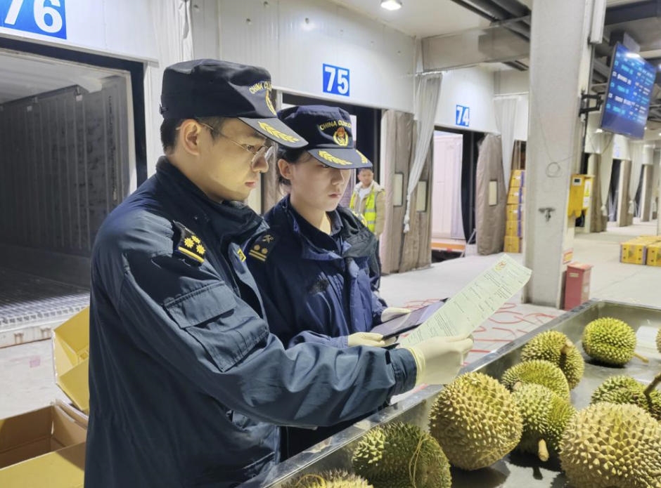 1月15日,友谊关海关工作人员对进口榴莲实施检疫查验。新华社发(南宁海关供图)