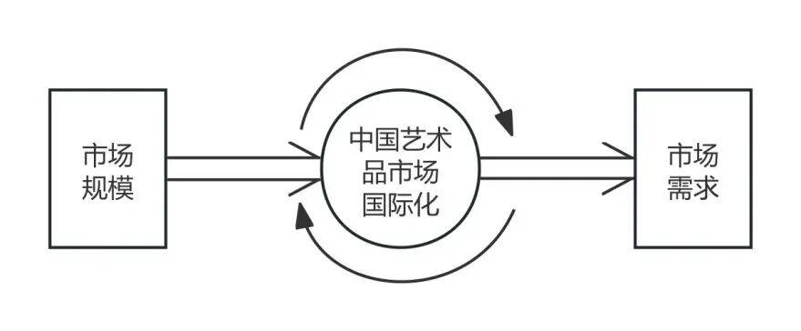 自发国际化过程指市场足够庞大后,艺术品市场国际化由市场需求拉动,形成自发过程。市场扩张后,能够吸收国际化作品并吸引国际艺术界,这是市场需求驱动的辅助性机制。核心在于中国艺术品市场庞大的系统本身具有强大惯性,国际化仅作为辅助角色,无法主导。