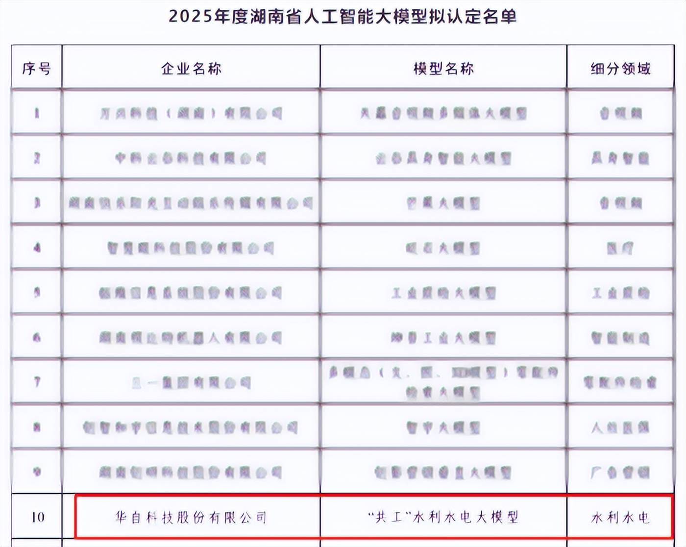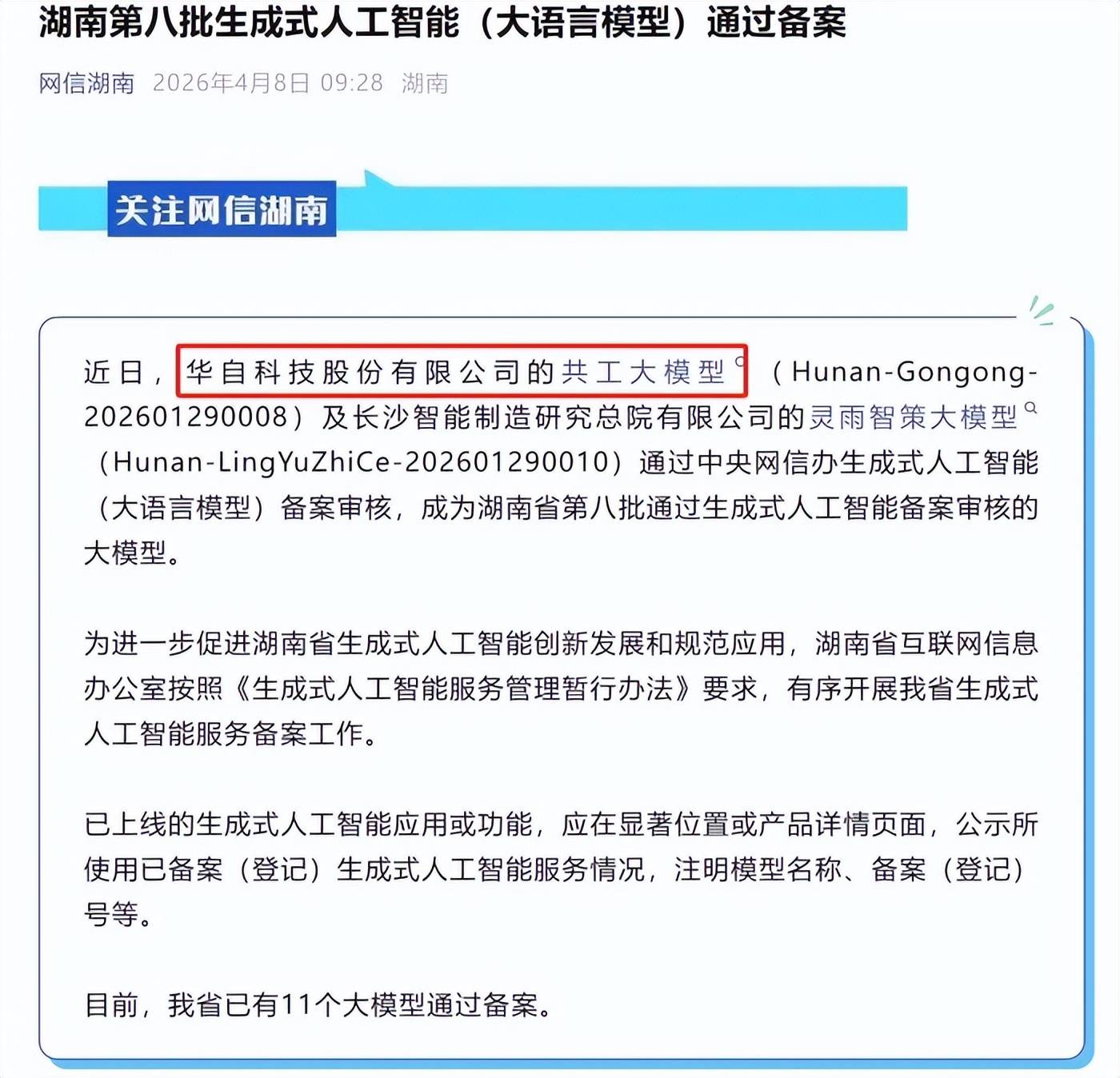 4月8日,湖南省互联网信息办公室发布第八批生成式人工智能(大语言模型)备案名单,华自科技“共工大模型”(备案编号:Hunan-Gonggong-2026012900008)顺利通过中央网信办审核,完成生成式人工智能服务备案,正式取得合规运营资质。