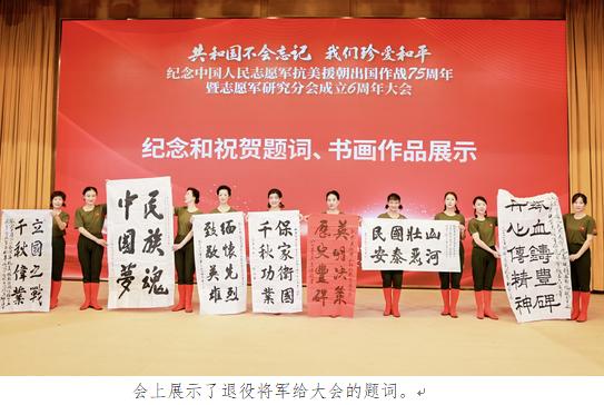为纪念中国人民志愿军抗美援朝出国作战75周年,祝贺志愿军研究分会成立6周年,一些志愿军老部队的高级将领、退役将军和书画艺术家发来了纪念和祝贺的题词。原国防大学政委赵可铭上将发来的题词是“立国之战 千秋伟业”;原南京军区政委雷鸣球上将发来的题词是“民族魂 中国梦”;原海军副政委王登平中将发来的题词是“缅怀先烈 致敬英雄”;原总政宣传部副部长嵇绍莹少将发来的题词是“保家卫国 千秋伟业”;原军事博物馆馆长袁伟少将发来的题词是“英明决策 历史丰碑”;原国防科技大学电子科学院政委段共生少将发来的贺词是“山河壮丽 国泰民安”;原军旅著名书法家刘建武大校发来的题词是“铁血铸军魂 丹心传精神”;著名书法家赵达武发来的贺词是“雄赳赳气昂昂 跨过鸭绿江”;著名书法家苏芬兰发来的贺词是“英烈赴国难,忠魂护九州”;著名书法家邹贵生发来的贺词是“铁血征程七五载 丹心研学六春秋”;中国东方巨龙书画艺术家研究协会理事长刘明友赠送了油画作品《邓华将军》《钢铁冰雕连》《铭记浴血荣光》;朝鲜社会科学院博士、北京朝艺在线文化交流有限公司总经理金哲赠送了庆贺油画作品《中朝友谊塔》,著名书画艺术家腾墨之、郑克石、张恒明、张元洁、张卫东、程波、洪大亮、刘尚峰等也都赠送了书画作品。