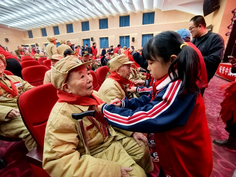 志愿军代表郑东弼、杨兴蓉、陈明兴先后上台发言。他们用质朴的语言,深情讲述那段艰苦卓绝却热血沸腾的历史,分享志愿军战士在冰天雪地的战场中爬冰卧雪、奋勇冲锋,在弹尽粮绝时仍坚守阵地、绝不退缩的英勇事迹,以及对“保家卫国、视死如归”信仰的执着坚守。一个个鲜活的故事,让在场听众仿佛置身当年的烽火战场,深刻感受到志愿军精神的伟大力量。发言结束后,全场齐声合唱《志愿军战歌》,“雄赳赳,气昂昂,跨过鸭绿江”的激昂旋律响彻全场,重现了志愿军战士保家卫国、奋勇向前的壮志豪情。