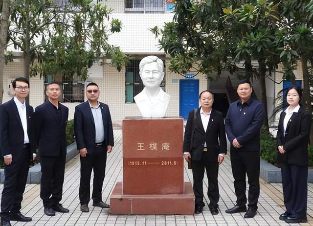 学校党总支班子成员、老师与全国基层党建网副主编张仕文(右3)在首任校长王朴庵雕像前合影
