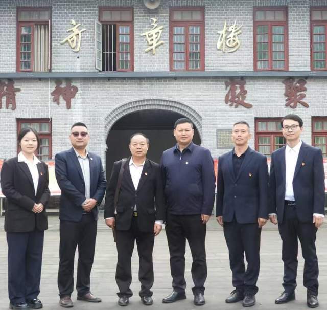 党总支班子成员、老师与全国基层党建网副主编张仕文(左3)参观奇章楼合影