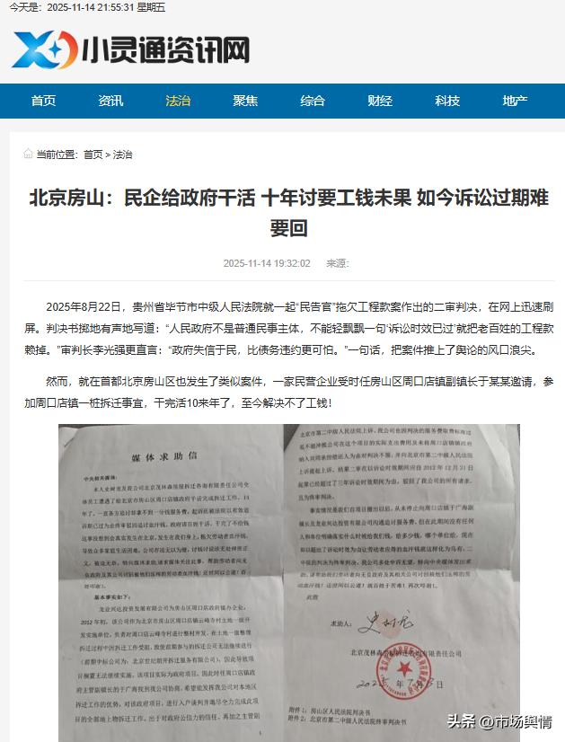 原标题:北京房山:民企给政府干活 十年讨要工钱未果 如今诉讼过期难要回