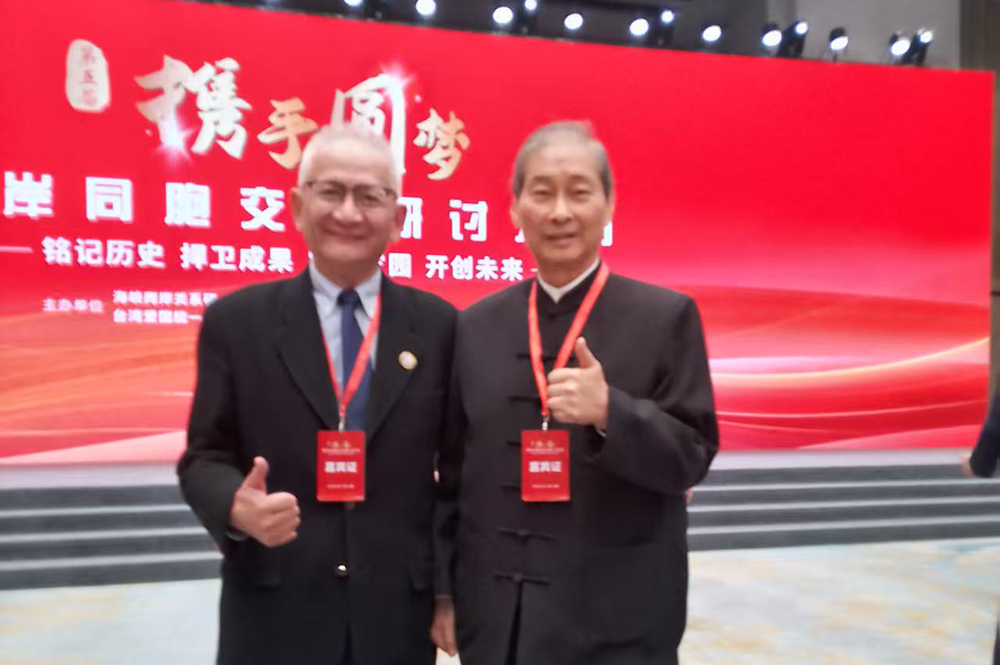 图说:活动现场气氛热烈。台湾省首任主席魏道明甥外孙、共工新闻社中国近代文史顾问钮则坚先生,与台湾中华统一促进党总裁张安乐亲切交流并合影留念。共工社发