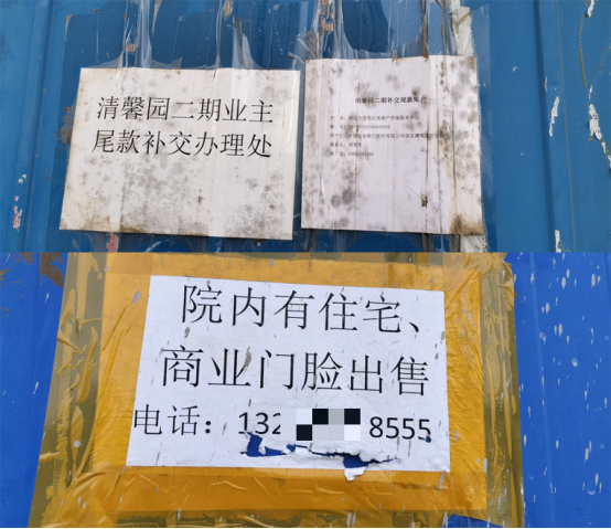 记者在现场看到, 清苑区清馨园小区二期如今围挡紧闭,围挡上贴有清苑区房地产服务中心关于收尾款的告知内容,也有售卖该项目房产的信息。经与售房电话(132XXXX8555)联系,对方一男士说,该项目6000一平米,如果一次性交齐房款,相