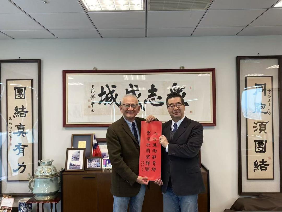会后,萧旭岑副主席向钮则坚先生致赠由马英九先生书写的春联,并一同合影留念。