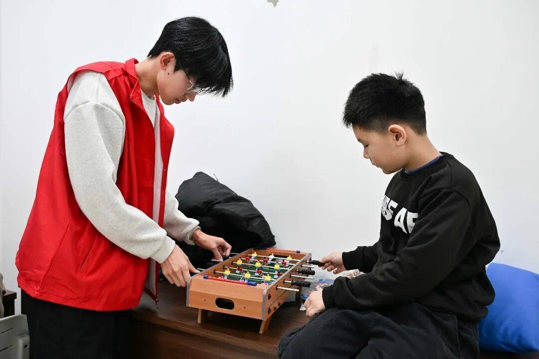 在托管班内,志愿者们在轻松愉快的氛围中开展了下棋、桌上足球等课外娱乐活动。形式简朴却内涵丰富的游戏,不仅有效锻炼了孩子们的动手能力与思维能力,也在互动协作中增进了彼此之间的交流与友谊。欢声笑语驱散了冬日的寒意,为略显单调的假期注入了温暖与活力,使孩子们在参与中感受到陪伴的力量与集体的温情。