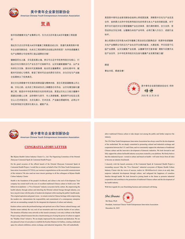 美籍华侨作家、法学博士、美中青年企业创新协会会长师帅从华盛顿发来贺信