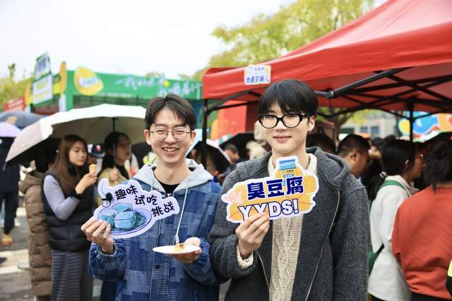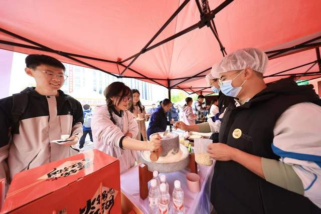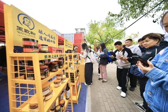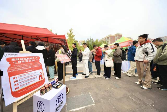 活动现场,王致和设置了多个互动区域。文创打卡区陈列着料酒钥匙扣、火锅产品冰箱贴等独具特色的文创产品,吸引了同学们的目光。美食体验区人气高涨,王致和臭豆腐干、拌饭酱配吐司片等特色美食引来年轻人排队品尝。食品科学与营养工程学院的一位同学表示,“这些文创设计很时尚,美食体验也让人惊喜,完全刷新了我对老字号的传统印象。”