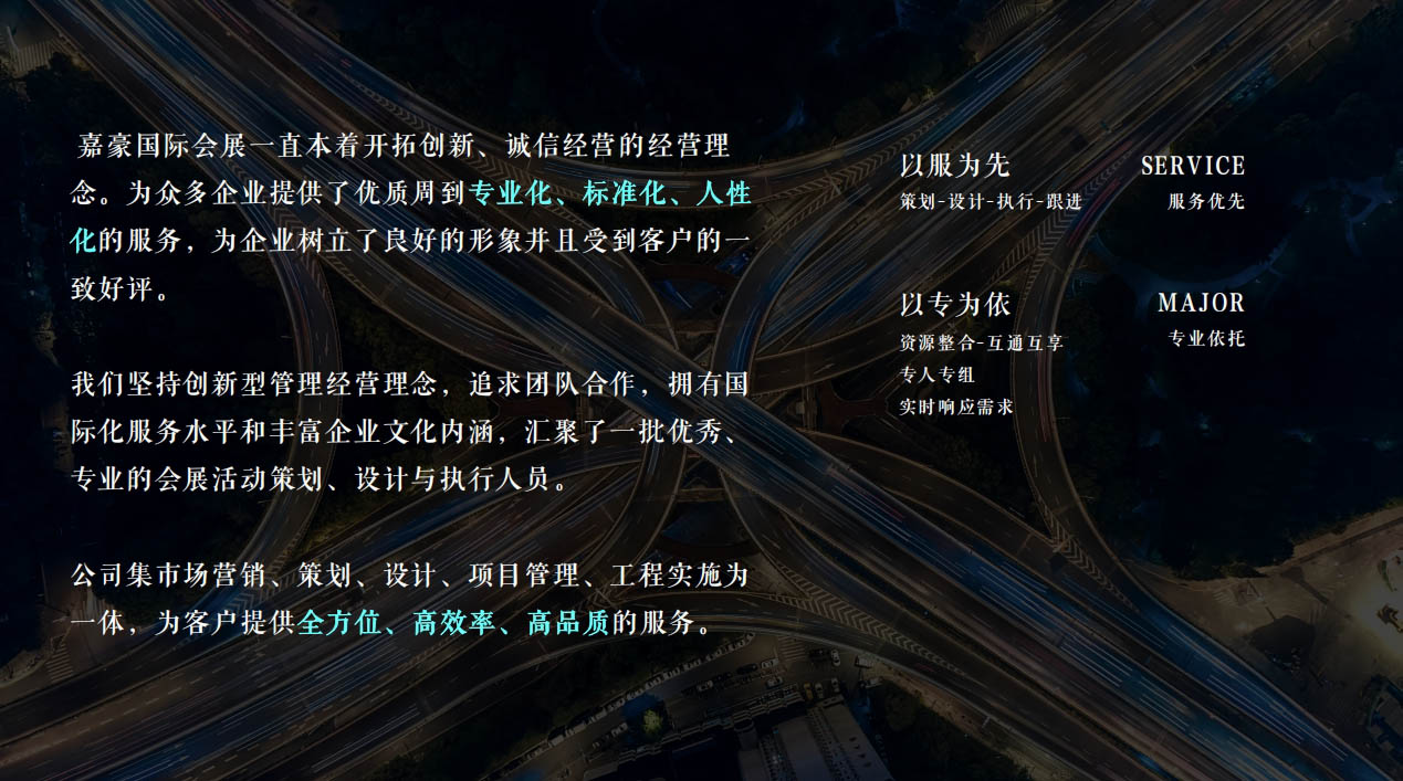 嘉豪国际会展集团积极提高自身服务能力,不断强化服务水平。为配合此目标及应对未来业务的发展,公司集市场营销、策划、设计、项目管理、工程实施为一体,为客户提供全方位、高效率、高品质的服务。